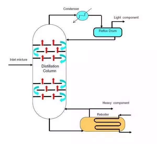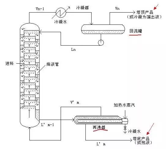 (4)对低沸点的回流液,因温度过高或泵的输出量过小,物料在泵内气化而不上量。精馏操作中出现液泛现象时,正常的操作要受到破坏,这时要分析产生液泛的原因,做出相应的处理。若是设备问题引起的,应该停车检修;若是操作不当,使釜温突然上升引起的,则应停止或减少进料量,稍降釜温,停止塔顶采出,进行全回流操作,使带到塔顶去的难挥发组分慢慢地流到塔釜。当生产不允许停止进料时,可将釜温控制在稍低于正常的操作温度下,加大塔顶的采出量,减小回流比,当塔压降至正常值后,再将操作条件恢复正常。这种操作只能保证产品的数量,而不能保证产品的质量。