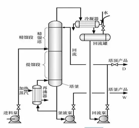 在制药、石油化工、精细化工等领域中,常常会有很多液相混合物需要分离或提纯,精馏技术便成为应用最广和规模最大的传质分离过程。今天给大家讲讲精馏塔的工艺参数如何调节以及其影响因素。 塔的压力是精馏塔主要的控制指标之一。任何一个精馏塔的操作,都应把塔压控制在规定的指标内,以相应地调节其它参数。塔压波动过大,就会破坏全塔的物料平衡和气液平衡,使产品达不到所要求的质量。所以,许多精馏塔都有其具体的措施,确保塔压稳定在适宜范围内。 对于加压塔的塔压,主要有以下两种调节方法。 ①塔顶冷凝器为分凝器时,塔压一般是靠气相采出量来调节的。在其它条件不变的情况下,气相采出量增大,塔压下降;气相采出量减小,塔压上升。 ②塔顶冷凝器为全凝器时,塔压多是靠冷剂量的大小来调节,即相当于调节回流液温度。在其它条件不变的前提下,加大冷剂量,则回流液的温度降低,塔压降低;若减少冷剂量,回流液温度上升,塔压上升。 对于减压精馏塔的压力控制,主要有以下两种方法。 ①当塔的真空借助于喷射泵获得时,可以用调节塔顶冷凝器之冷剂量或冷剂温度从而改变尾气量的方法来调节塔的真空度。 当被分离的物料允许与空气接触时,在此控制方案中,蒸汽喷射泵在最大的能力下工作,调节阀装在通大气的管线上,用调节阀开度的大小,调节系统的尾气抽气量,从而达到调节塔的真空度的目的。 ②当采用电动真空泵抽真空时,调节阀装在真空泵的回流管线上,用调节阀开度的大小来调节系统的尾气抽出量,从而调节塔的真空度。 对于常压塔的压力控制,主要有以下三种方法。 ①对于塔顶压力的稳定性要求不高的情况下,无需安装压力控制系统,应当在精馏设备(冷凝器或回流罐)上设置一个通大气的管道,以保证塔内压力接近于大气压。 ②对于塔顶压力的稳定性要求较高或被分离的物料不能和空气接触时,塔顶压力的控制可采用加压塔加压的控制方法。 以上调节塔压的方法未考虑不凝气实际需分析来调节塔的气相压力。 『2』 釜温是由釜压和物料组成决定的。精馏过程中,只有保持规定的釜温,才能确保产品质量。因此釜温是精馏操作中重要的控制指标之一。 当釜温变化时,通常采用改变再沸器的加热蒸汽量,将釜温调节至正常。当釜温低于规定值时,应加大蒸汽用量,以提高釜液的气化量,使釜液中重组分的含量相对增加,泡点提高,釜温提高。当釜温高于规定值时,应减少蒸汽用量,以减少釜液的气化量,使釜液中轻组分的含量相对增加,泡点降低,釜温降低。 釜温波动的原因比较多。当塔压突然升高时,釜温会随之升高,而后又下降。这种釜温的升高是因为压力升高引起了釜液泡点的升高所致。因而,塔内的上升蒸气量不但不会增加,反而还会因为压力的升高而减少;这样,塔釜混合液中轻组分的蒸出就不完全,将导致釜液泡点的下降,因而使釜温又随之下降。反之,当塔压突然下降时,塔内的上升蒸气量会因塔压的降低而增加,造成塔釜液面的迅速降低,这样重组分可能被带至塔顶。随着釜液中组分的变重,釜液的泡点升高,釜温也会随之升高。由此看来,塔压是引起釜温变化的重要因素。因此,操作中只有首先把塔压控制在要求的指标上,才能确切地知道釜温是否符合工艺要求,否则会导致错误的操作。 釜温也会随着进料中轻组分浓度的增加而降低,重组分浓度的增加而升高。另外,釜中有水、再沸器中物料聚合堵塞了部分列管、加热蒸汽压力的波动、调节阀的失灵、物料的平衡采出受到破坏等,都能引起釜温的波动。釜温波动时,要分析引起波动的原因,加以消除。例如,塔顶采出量过小,使轻组分压入塔釜而引起釜温下降。此时若不增加塔顶采出,单纯地加大塔釜加热蒸汽的用量,不但对釜温没有作用,严重时还会造成液泛。又如,再沸器的列管因物料聚合而堵塞,致使釜温下降,此时,应停车对设备进行检修。 『3』 回流比是根据对原料的分离要求确定的。回流比过大或过小,都会影响精馏操作的经济性和产品的质量。加大回流比,可使塔顶产品中的轻组分浓度增加,但是,却减小了塔的生产能力,也使塔顶冷量、塔釜热量的消耗增大。在正常操作中应保持适宜的回流比,在保证产品质量的前提下,争取最好的经济效果。只有在塔的正常生产条件受到破坏或产品质量不合格时,才能调节回流比。 例如,塔顶产品中重组分含量增加,质量下降,要适当增大回流比。塔的负荷(进料量)过低,为了保证塔内一定的上升蒸气速度,也要适当增大回流比。对于大型的生产装置,当不同类型的塔板结构与上升蒸气速度的要求及仪表的设计工作范围与实际生产量的大小产生矛盾时,可以相应地适当改变回流比。又如浮阀塔板,如果处理能力只有设计能力的50-60%时,为了使浮阀在适宜范围内工作,为了让仪表的测量范围在适宜的工作范围内,应采取加大回流比来保证生产的稳定,这对大型生产装置维持必要的稳定生产是极为重要的。 调节回流比的方法可有如下几种: ①减少塔顶采出量以增大回流比。 ②塔顶冷凝器为分凝器时,可增加塔顶冷剂的用量,以提高凝液量,增大回流比。 ③有回流液中间贮槽的强制回流,可暂时加大回流量,以提高回流比,但不得将回流贮槽抽空。 『4』 塔压差是衡量塔内气体负荷大小的主要因素,也是判断精馏操作的进料、出料是否均