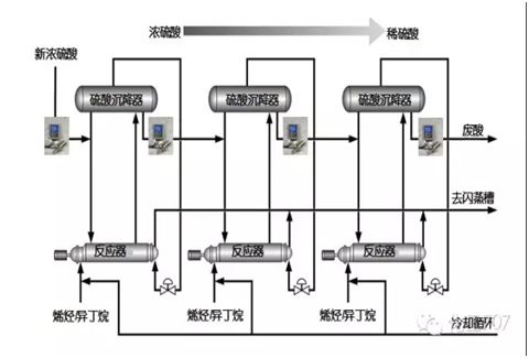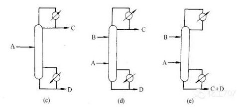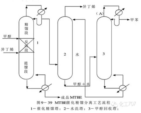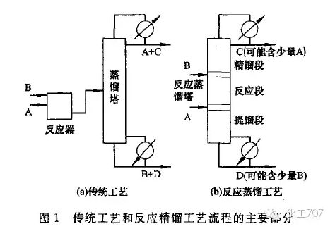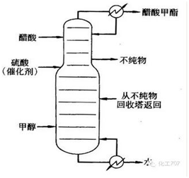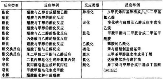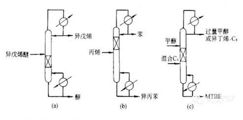 反应精馏(Reactive Distillation)工艺的出现,彻底改变了长期以来人们对反应和分离过程的传统认识,它使化学反应过程和精馏分离的物理过程结合在一起,是伴有化学反应的新型特殊精馏过程。 关于反应精馏: 在进行反应的同时用精馏方法分离出产品的过程。可以是为提高分离效率而将反应与精馏相结合的一种分离操作;也可以是为了提高反应转化率而借助于精馏分离手段的一种反应过程。 反应精馏的原理: 对于可逆反应,当某一产物的挥发度大于反应物时,如果将该产物从液相中蒸出,则可破坏原有的平衡,使反应继续向生成物的方向进行,因而可提高单程转化率,在一定程度上变可逆反应为不可逆反应。 反应精馏技术的应用: 应用很广泛,例如酯化、酯交换、皂化、胺化、水解、异构化、烃化、卤化、脱水、乙酰化和硝化等反应,具体反应举例见下表: 反应精馏仅适用于反应过程和反应组分的蒸馏分离可以在同一温度条件下进行的化学反应。如果反应组分之间存在有恒沸现象,或者反应物与产物的沸点非常接近时,反应精馏技术则不适用。已经达到商业规模或者进行过实验室研究的工业上,重要的反应精馏过程主要包括以下反应类型: 1、烷基化 乙烯与苯烷基化的RD塔由二部分组成,上部填装特殊设计的捆扎包内装Y型分子筛,下部安装精馏塔板,乙烯从催化剂层底部进料,苯从回流罐进塔,过程的特点是反应温度受饱和点温度制约,避免反应区热点的生成,提高了催化剂的寿命,副产物二乙丙苯和三异丙苯返回RD塔,与苯进行烯烃转移反应生成更多的异丙苯,消除了大量苯的循环,反应热有效利用。与传统工艺比较,RD过程节能50%,投资降低25%。但是催化剂的活性和选择性相差较大,因此必须开发出适合的催化剂。 2、叠合过程 采用反应精馏技术可使烯烃分子有选择的叠合,因为精密的温度控制和反应段的宽分布将减少非理想产品的二聚物、三聚物或高聚物的生成,丁烯叠合的反应精馏工艺目前已获工业许可。 3、烯烃选择性加氢 已经证明,反应精馏可使不需要的烯烃杂质选择加氢,使其失去化学活性或不有利于精馏分离去除。目前,可应用反应精馏技术的有:丁二烯、戊二烯及己二烯选择性加氢。 4、酯转移 某些化学反应所使用的酸具有腐蚀性。为了避免酸性腐蚀,可以以酯的形式引入酸。例如,甲酸甲酯分解会生成甲酸和甲醇,而甲酸一旦形成就被平衡反应消耗掉,这样避免了甲酸的腐蚀。 5、氧化脱氢 如有合适的催化剂,就可使异丁烷氧化脱氢生成异丁烯。 6、醚化反应 甲基叔丁基醚(MTBE)是应用RD技术第一个取得工业成功的产品,该过程与传统流程相比具有无反应器的外部循环和冷却;通过预反应有效脱除催化剂毒物,延长催化剂的使用寿命;充分利用反应放出的热量,反应物转化率高以及产品纯度高等特点。 7、酯化和水解 乙酸甲酯(MeOAc)合成与水解的催化精馏工艺是近年来国内外研究和开发的热门话题,由于乙酸和甲醇的酯化受化学平衡的限制,且物系中有多个共沸物,故传统流程十分复杂,需多个反应器和精馏塔。 ▲醋酸甲酯反应精馏塔 由1983年Estman化学公司开发的反应精馏工艺。 8、其它反应 其它有可能利用反应精馏方法的领域包括:氧化,电化学,合成气反应,从醇和氨选择性地生产胺,羧基化反应。除此之外,通过引入第三组分(即反应夹带剂),反应精馏技术就能用于分离沸点极为接近的混合物。如:分离C1芳烃,氯苯胺。甲基吡啶等同分异构体的混合物。 几种反应精馏流程: 反应A←→C,若产物比反应物易挥发αC>αA, 进料位置在塔下部或塔釜。 反应A←→C,若反应物比产物易挥发αA >αC,进料位置在塔上部或塔顶。 反应A←→C+D 或A→C→D,C 为目的产物,相对挥发度αC>αA >αD。 反应A+B←→C+D,反应物的挥发度介于两产物之间,αC>αA>αB >αD。 反应A+B←→C+D,相对挥发度,αA>αB >αC>αD。 工业上一个典型的催化精馏过程,甲醇和异丁烯在强酸性离子交换树脂上催化反应生成甲基叔丁基醚(简写为MTBE): 几种催化精馏流程的反应段位置: a-异戊烯醚脱醚;b-苯烷基化;c-合成MTBE 注:催化剂填充段应放在反应物含量最大的区域
